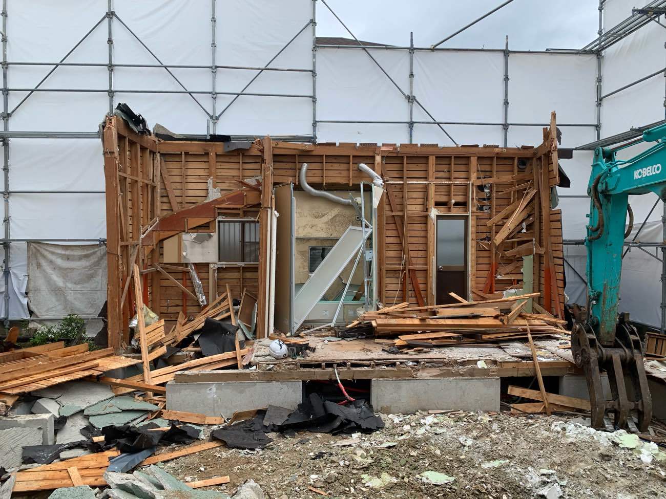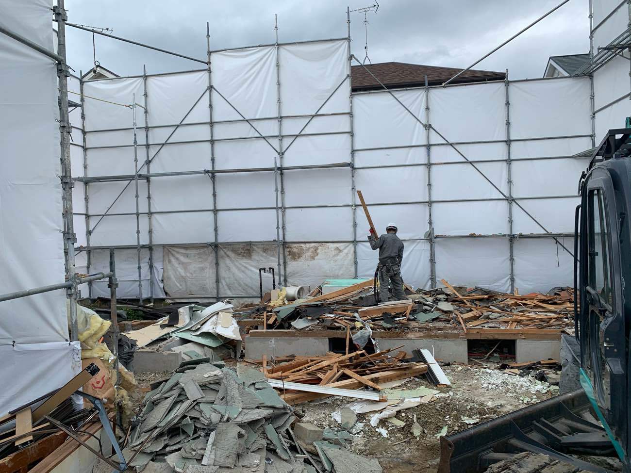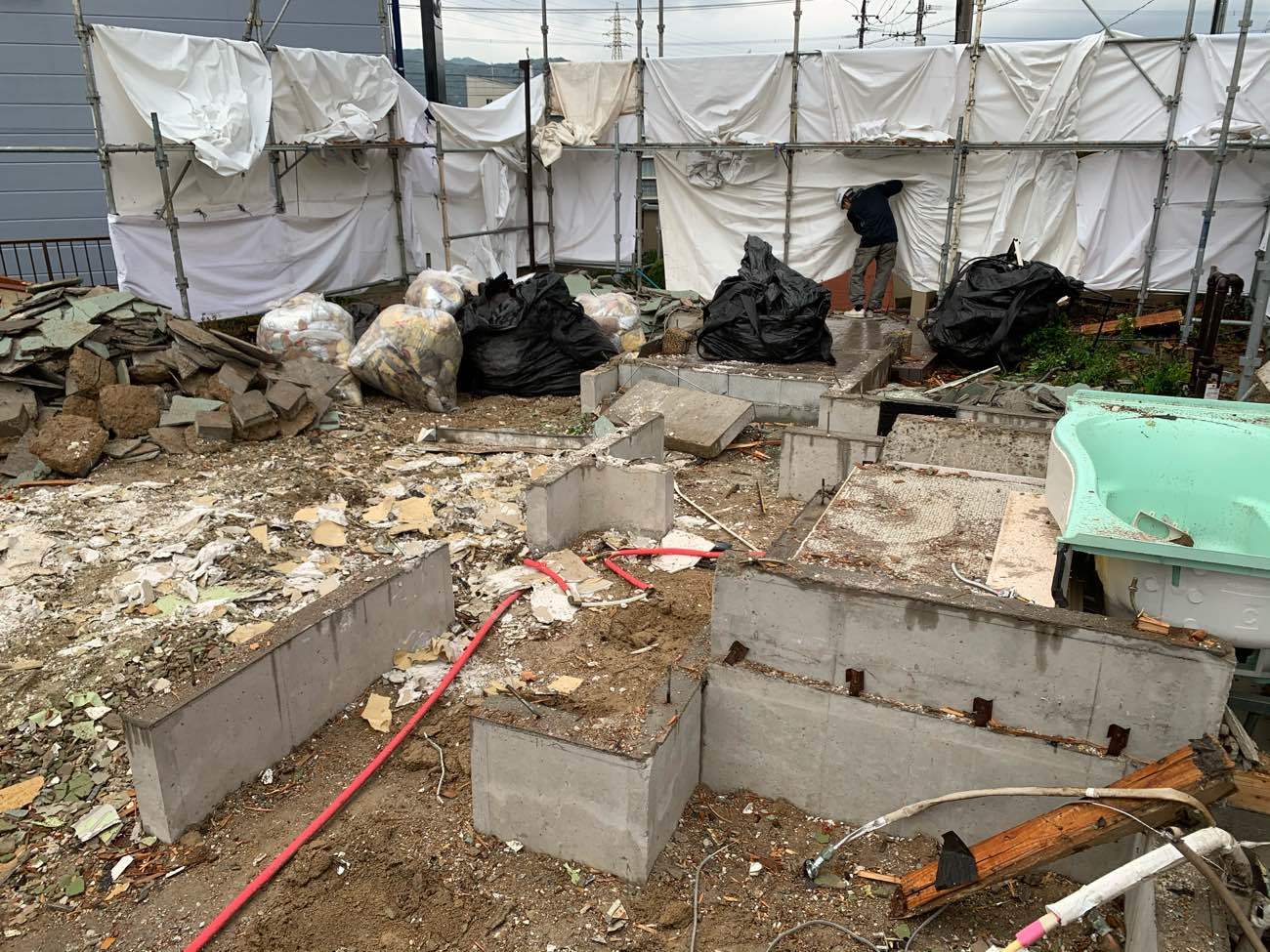 足場解体(外注),コンクリートガラ積込・搬出,基礎解体,廃材片付け
